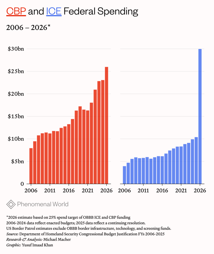 These institutional attacks were complemented by massive new investments in the domestic enforcement apparatus. Last summer, Trump’s signature domestic bill poured a staggering $171 billion into immigration enforcement through 2029. A glimpse of the line items reveals the sheer scale of the investment: $46.6 billion to complete the border wall; $45 billion to expand immigration detention centers; $18.2 billion for border facilities and initiatives; and $30 billion on top of ICE’s $9.6 billion base budget to bolster deportation and removal operations. ICE’s annual budget increased threefold to around $28 billion through 2029, making it the largest federal law enforcement agency in the country.