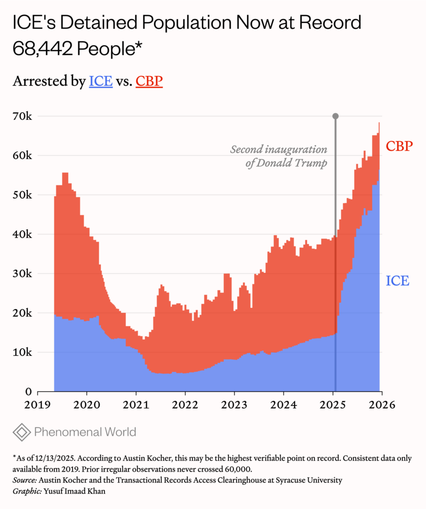 Detention data indicates the full extent of this interior surge. When the detainee numbers are broken down by the arresting agency, we see that the proportion of ICE arrests increased from 28 percent of total detained in January to 82 percent as of December 13. The same data shows that the total number of average detainees reached 50,000 in June, a figure not seen since 2019, and exceeded 65,000 by the end of last year—the highest in recorded history.