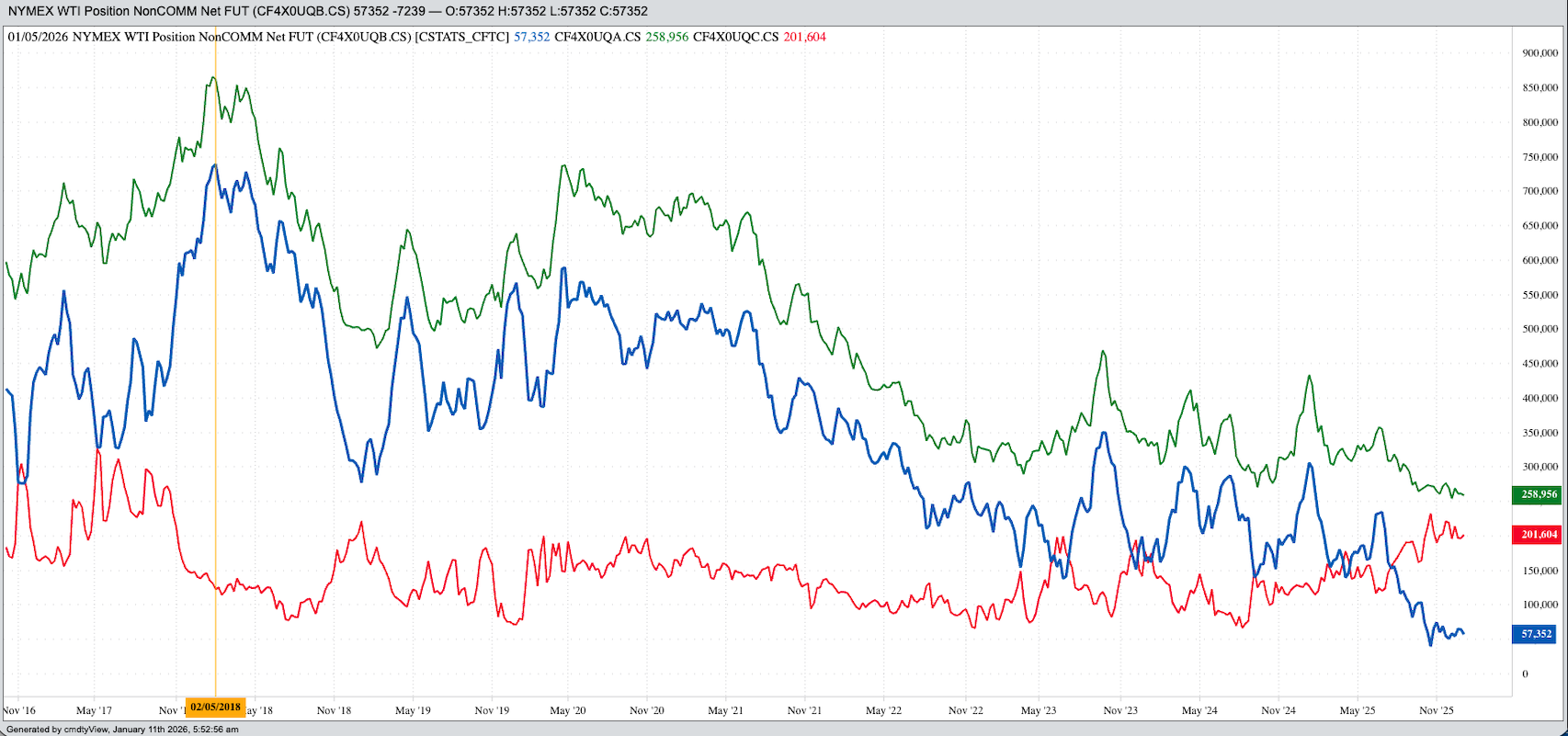 Let’s start with the noncommercial side. Applying Newton’s first law of motion to markets we know a trending market will stay in that trend until acted upon by an outside force, with that outside force usually the flow of investment money. A look at the chart for WTI crude oil futures created by pulling CFTC Commitments of Traders report (legacy, futures only) numbers and we see the flow of investment money has not change. Back in early February 2018 funds held a net-long futures position of 739,100 contracts. This included long futures of 862,100 contracts. Fast forward to the latest update, for the week ending Tuesday, January 6, and we see funds held a net-long of 57,352 contracts, a decrease of 7,239 contracts from the previous week. The chart also shows us the net-long futures position is within sight of its recent low of 39,800 from October 21, 2025. This sets the stage for a possible change in the outside force. But the investment side needs a fundamental reason to change its mind[ii], creating the debate over if we could now view crude oil’s supply and demand situation as bullish.