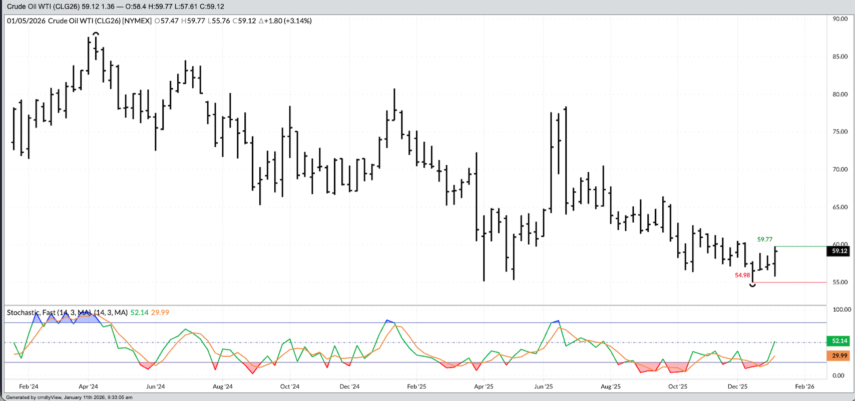 As you can tell, I remain skeptical of a bullish change to US and global crude oil fundamentals, despite forward curves for both WTI and Brent continuing to show backwardation through the February 2027 futures contract. But, if algorithms still see a backwardated forward curve and the equation tells them this means bullish fundamentals, regardless of headlines, again with the existing net-long futures position near its recent smallest level, crude oil could see a round of fund buying. We could know shortly after the market opens Sunday evening given the new 4-week high[iii] headed into this week’s trade is last week’s mark of $59.77, with the spot-month WTI contract (CLG26) closing Friday at $59.12. Over in the Brent market the 4-week high is last week’s mark of $63.91 with Friday’s close at $63.34 (QAH26).