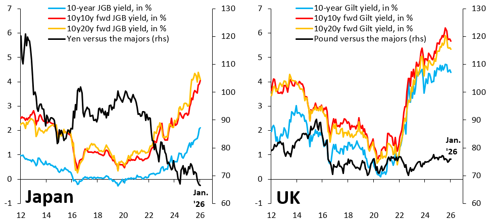 Perhaps the most important point to make is that we’re already seeing low-grade debt crises in a bunch of places. The left chart above shows the trade-weighted Yen versus its G10 peers (black line) along with the 10-year Japanese government bond (JGB) yield (blue line), the 10y10y forward JGB yield (red line) and the 10y20y forward JGB yield (orange line). The 10y10y forward yield is backed out from 10- and 20-year JGB yields and reflects what markets price for the 10-year yield in 10 years’ time. The 10y20y forward yield is backed out from 20- and 30-year JGB yields and reflects what markets price for the 10-year yield in 20 years’ time. The really worrying thing in this chart is that the Yen has fallen materially, even as JGB yields have risen to unprecedented levels. That’s a sign that a debt crisis is underway. The Bank of Japan (BoJ) is capping yields via still very large gross purchases of JGBs. As a result, the risk premium that would show up in the bond market is showing up in the currency.