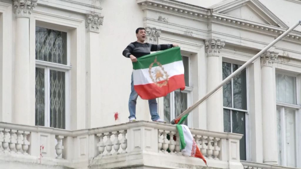 EBUAfgelopen zaterdag beklom een pro-Pahlavi-demonstrant de Iraanse ambassade in Londen, en wapperde met de oude vlag“Mensen klampen zich aan Pahlavi vast, omdat hij tegenwicht biedt aan de Islamitische Republiek”, zegt Sanam Vakil. Zij is Midden-Oostendeskundige bij denktank Chatham House in Londen. “Hij is een belangrijke stem binnen de oppositie, maar die is gefragmenteerd.”