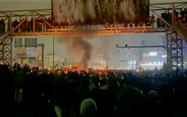 In this frame grab from footage circulating on social media from Iran shows protesters taking to the streets despite an intensifying crackdown as the Islamic Republic remains cut off from the rest of the world in Tehran, Iran, January 9, 2026. (UGC via AP)
