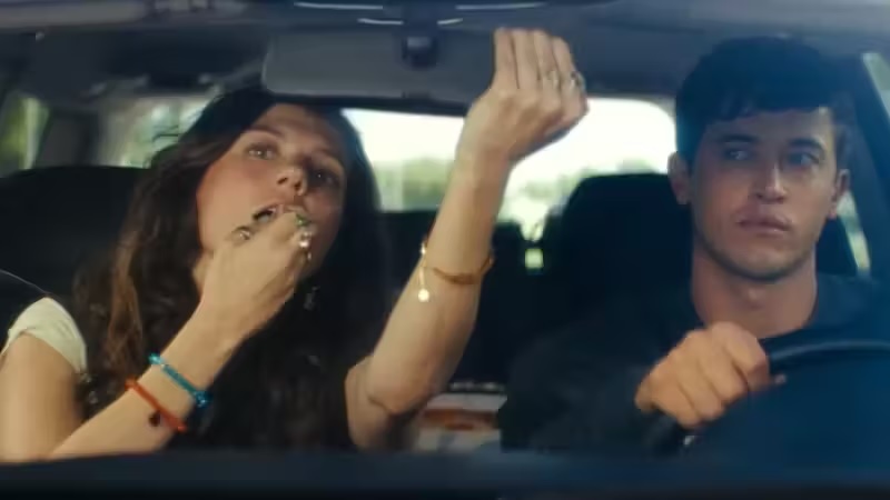 On the page, Poppy (Emily Bader) and Alex (Tom Blyth) first clock each other during orientation at the University of Chicago, where she mentally files him under “too nerdy, will investigate later” and they don’t properly bond until a long drive home months down the track. The film skips the slow burn and has them first properly meet at the end of the school year at Boston College, when a mutual mate ropes them into carpooling back to Ohio, complete with Poppy locking the keys in the car and an emergency motel stay with — you guessed it — only one bed.