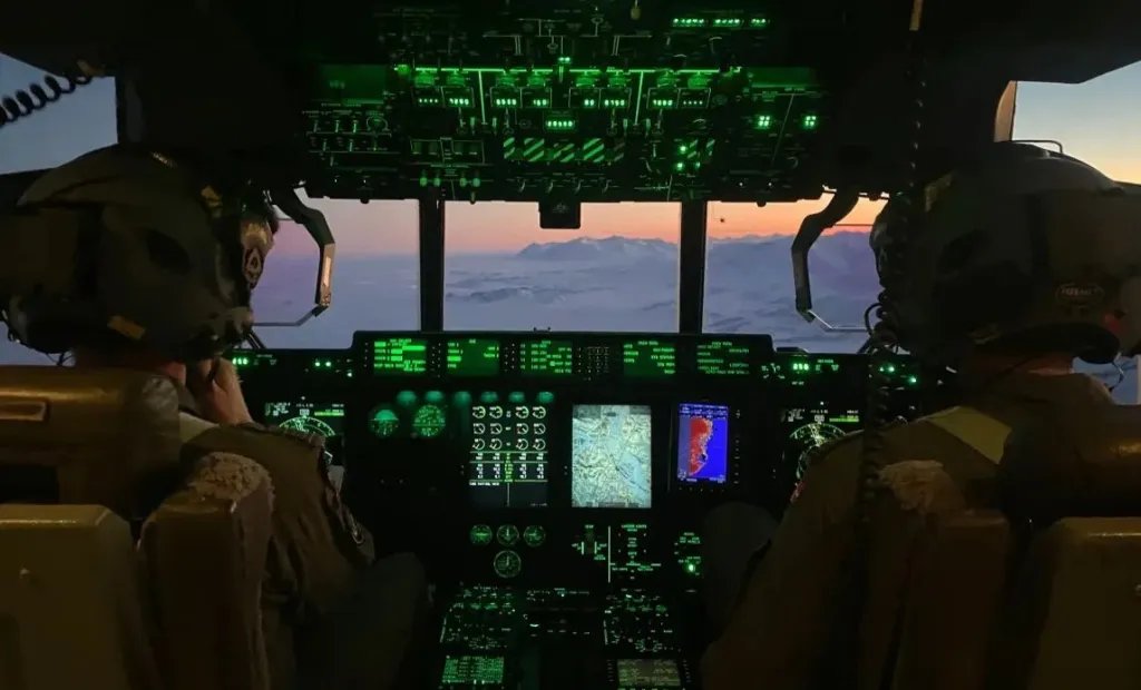 The view from the flight deck of a Royal Danish Air Force C-130J transport during a mission over Greenland. Royal Danish Air Force