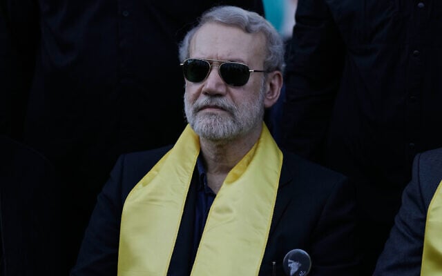 Ali Larijani, secretary of Iran’s Supreme National Security Council, attends a ceremony at Hezbollah leader Hassan Nasrallah’s grave in Beirut, Lebanon, Saturday, Sept. 27, 2025, marking the first anniversary of Nasrallah’s assassination in Israeli airstrikes. (AP Photo/Bilal Hussein)