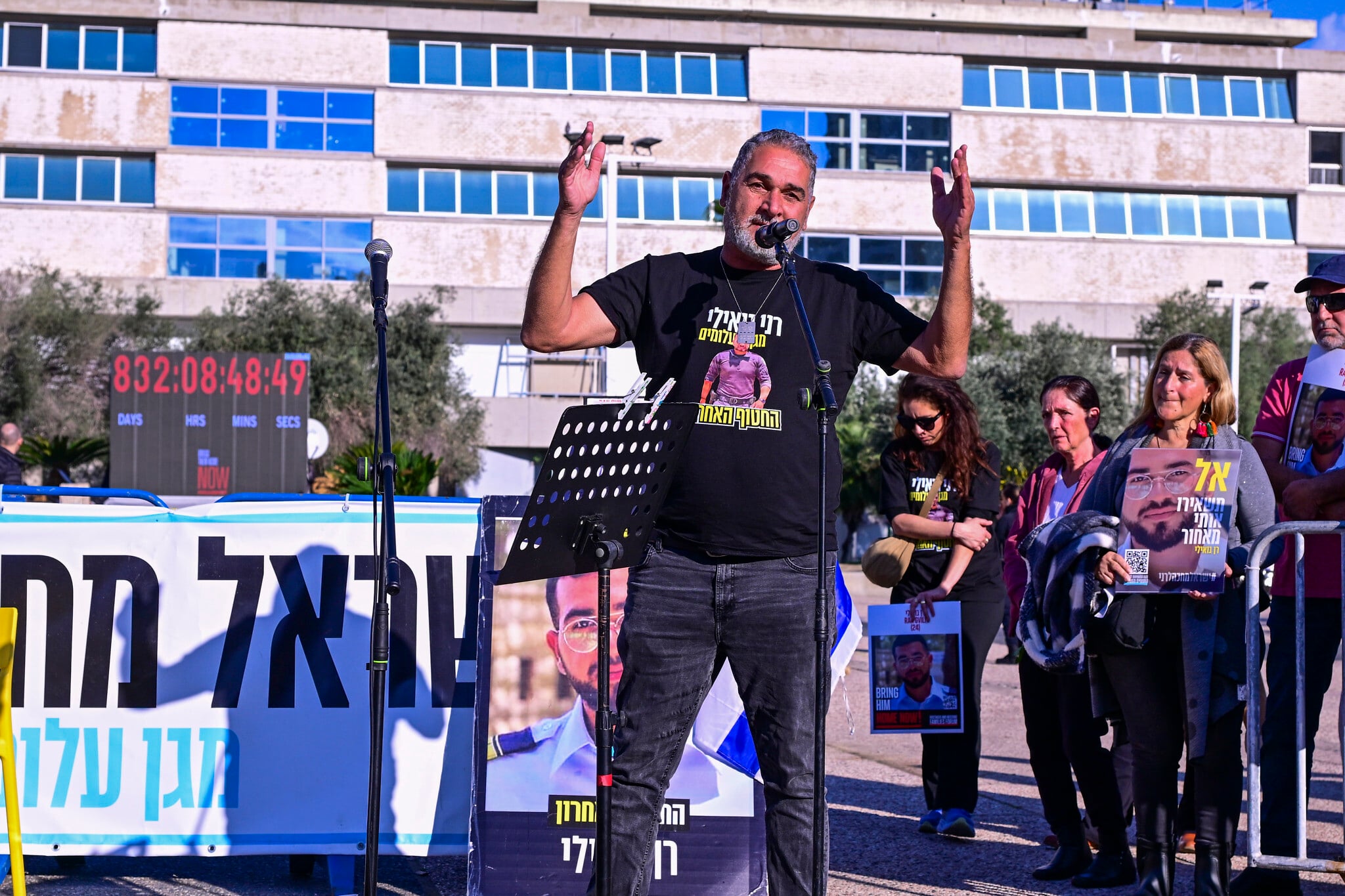 Itzik Gvili calling for the return of his son, Master Sgt. Ran Gvili, whose body remains in Gaza, at a Shabbat service at Hostages Square in Tel Aviv, on January 16, 2026 (Avshalom Sassoni/Flash90)