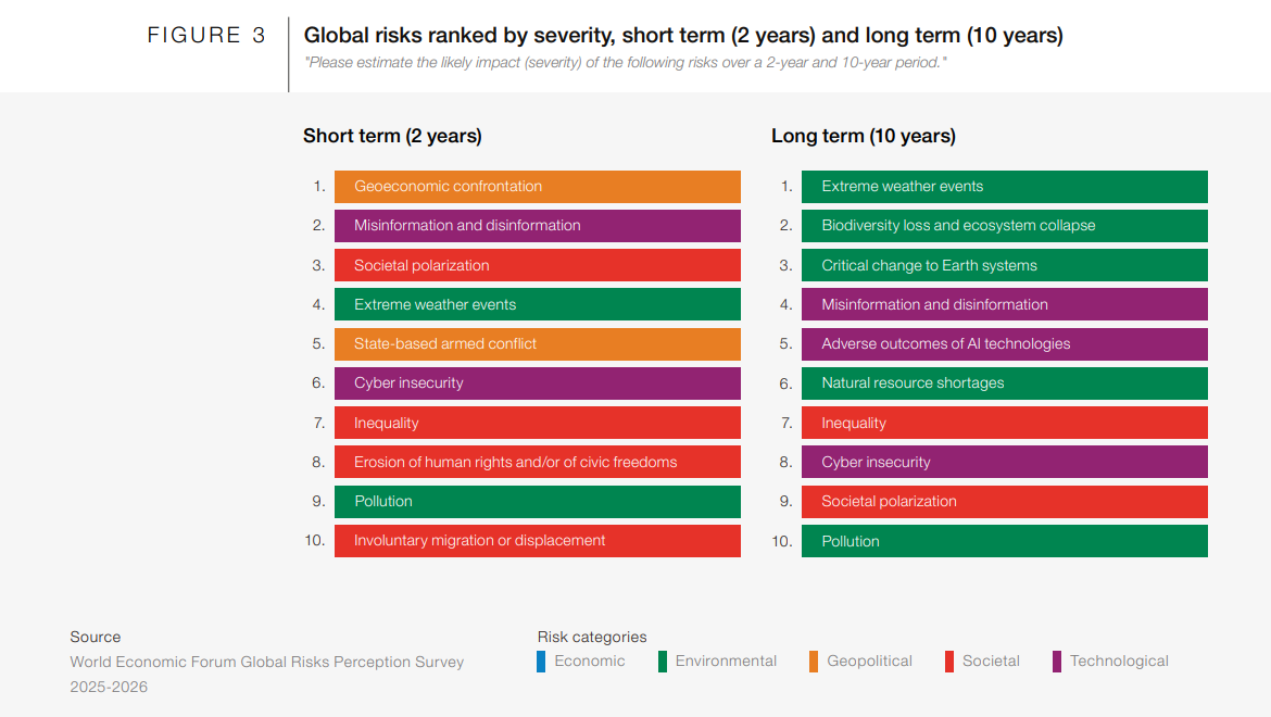 Yet global leaders identify climate-driven disruption as the most likely defining risk of the 2030s.  Looking a decade into the future, climate collapse and extreme weather dominate the risk landscape, according to the World Economic Forum’s newly published Global Risks Report 2026 . Economic downturn, by contrast, sits far lower on the list at 24.