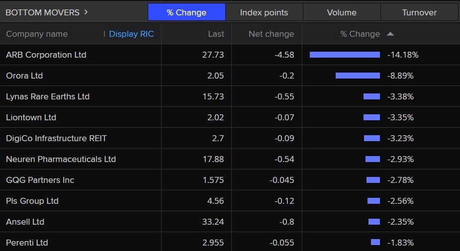 And here are the bottom movers, with ARB Corporation Ltd down -14.2%.