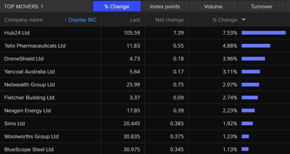 Here are the top movers, with Hub24 Ltd leading morning trade, up 7.5%.
