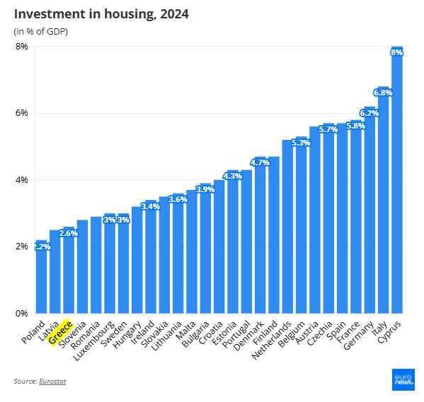 Στην ΕΕ το 2024, το 5,3% του ΑΕΠ επενδύθηκε στη στέγαση, σύμφωνα με τα τελευταία στοιχεία της Eurostat.