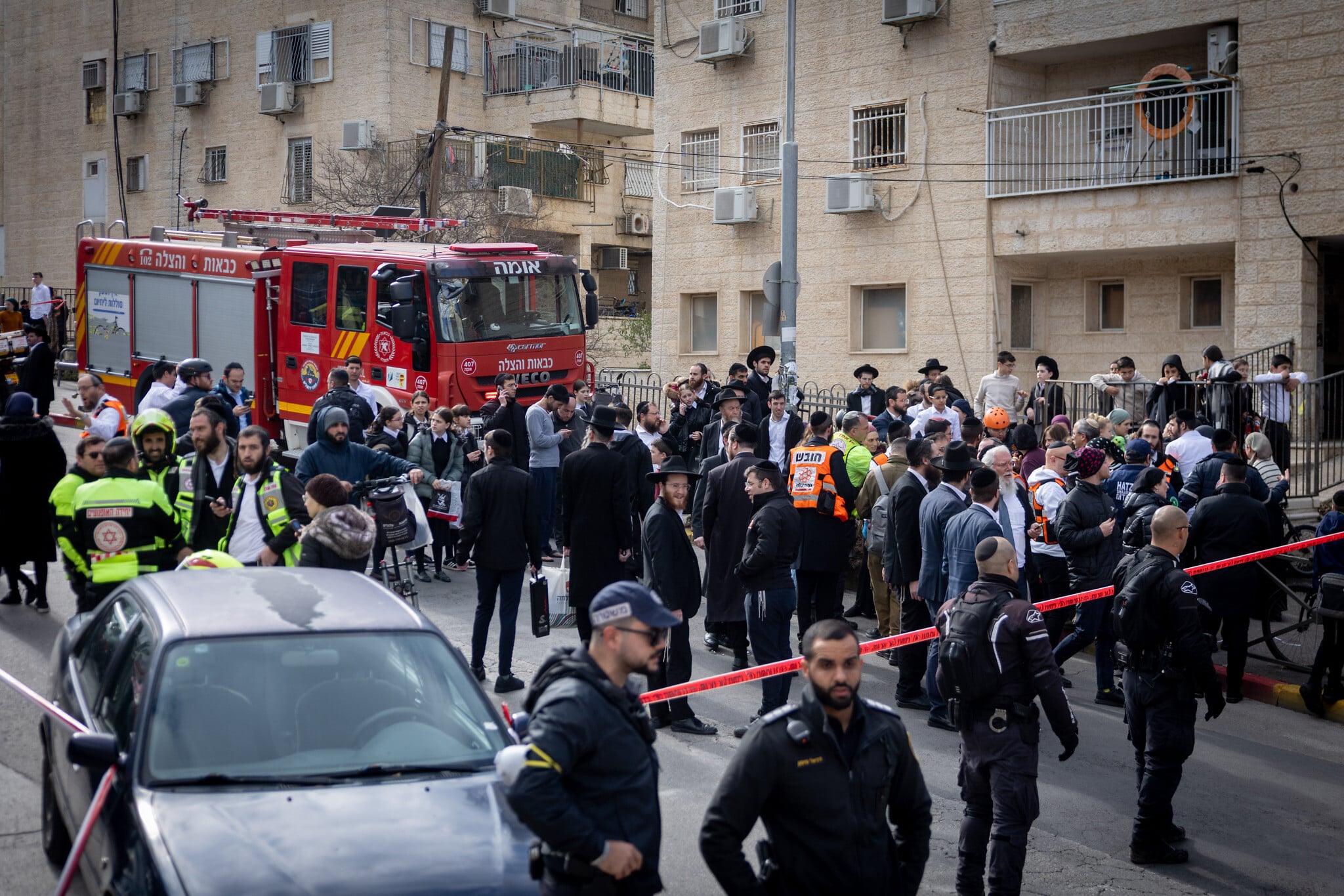 Rescue and security forces work at the scene of a mass-casualty incident at an unlicensed daycare in Jerusalem’s Haredi-majority Romema neighborhood, on January 19, 2026 (Chaim Goldberg/Flash90)