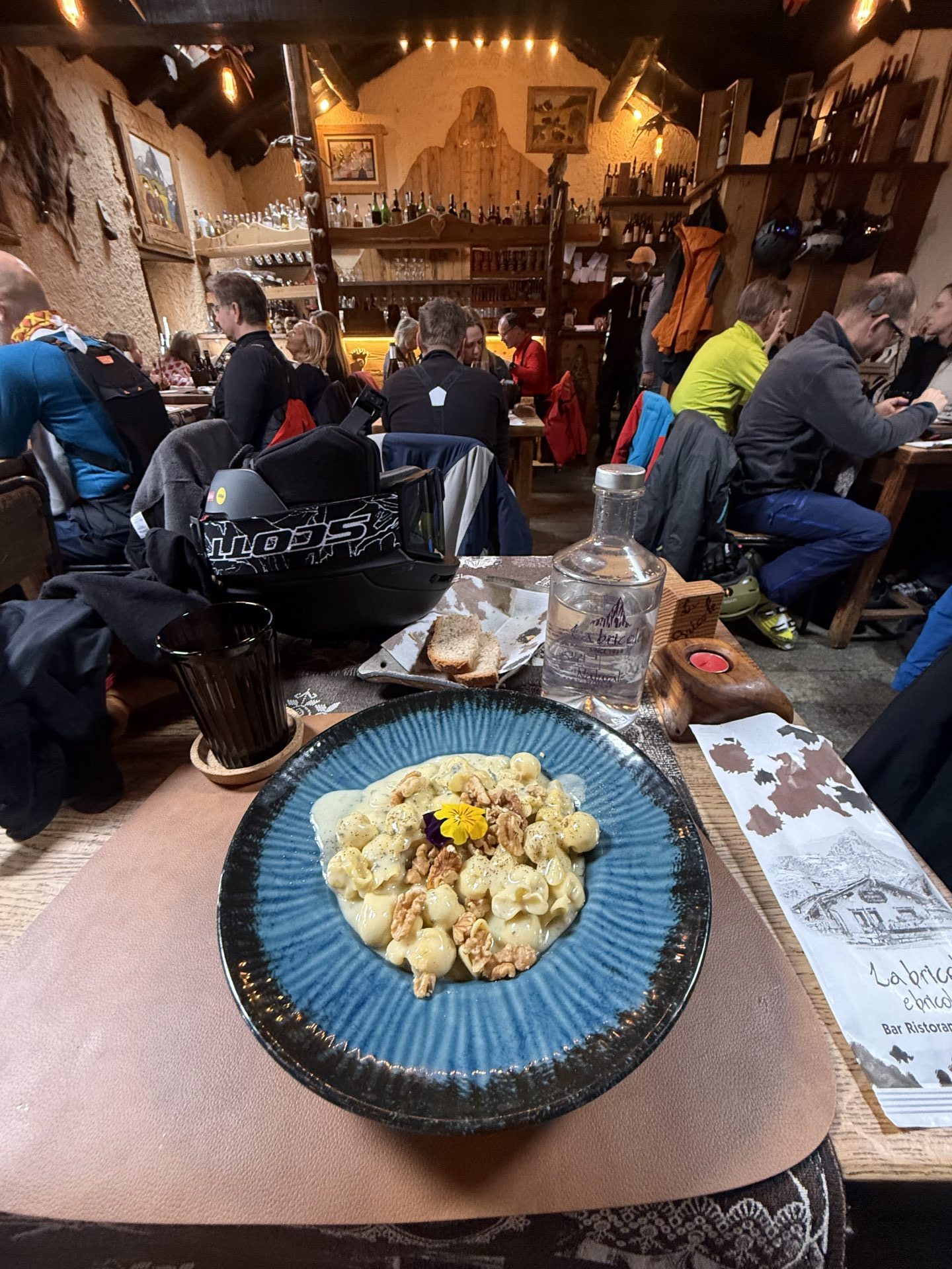 Lunch was the highlight of the day: fagottini pasta served with gorgonzola sauce, walnuts, and wine-poached pears. Fresh, perfectly al dente, rich but balanced, and remarkably affordable compared to Swiss on-mountain pricing. It’s the kind of dish that stays in your memory long after the ski day ends.