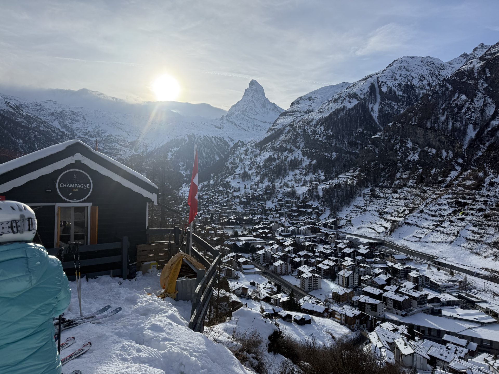 Instead, we continued downward toward Adler Hitta for a brief afternoon break. Then came the final mission: catching one of the last chairs from Findeln to set up the long Ried route home. The Ried run (2) is a narrow but scenic descent that passes the famous Champagne Bar before opening into wide valley views of Zermatt and the Matterhorn looming above town.