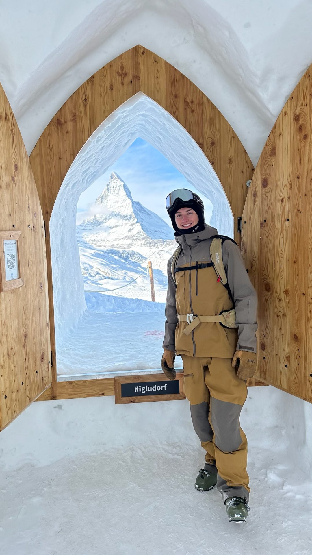 Partway down, we paused at one of the most scenic viewpoints in the Alps: the Iglu-Dorf near Riffelberg. Perched beside run 45 (Iglupiste), this ice-hotel sits directly in front of the Matterhorn’s north face. It’s the kind of place that forces you to stop, not for rest, but simply to take in the scale of the landscape.