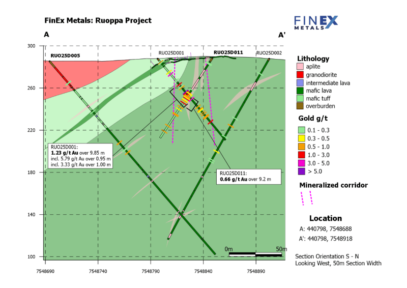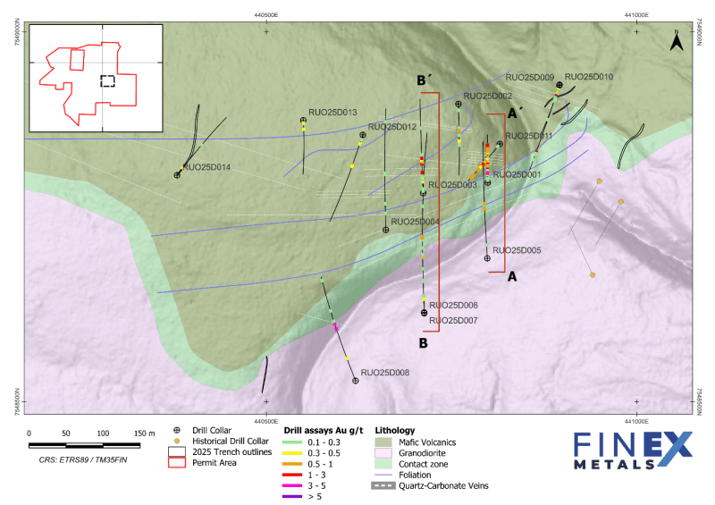 The rationale for locating the five first reported holes RUO25D001, 002, 003, 009 and 010 was described in FinEx press release dated November 25, 2025. The remaining drill holes were collared to expand the known mineralization towards the south and west. Drill holes RUO25D005 to RUO25D008 tested the contact zone between the volcanics and granodiorite intrusion as well as the vertical continuation of gold bearing quartz veins at depth under trenches RUO24T1 and RUO24T2. Drill holes RUO25D004 and RUO25D012 tested the continuation of east-west striking gold bearing quartz-carbonate veins under trenches RUO24T1 and RUO24T2. Drill holes RUO25D013 and RUO25D014 were step outs. RUO25D014 was situated 420 metres west of drill hole RUO25D001.