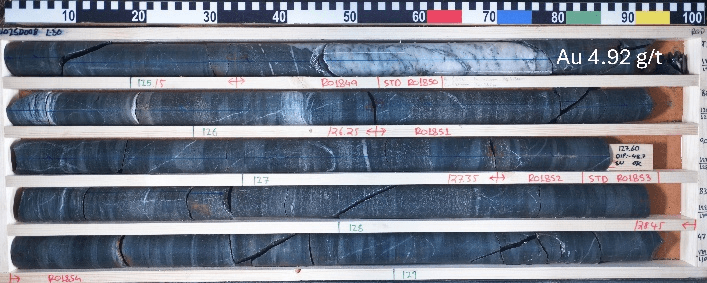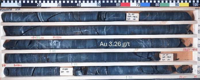 Figure 5:  Photos of drill core from hole RUO25D008, including sample intervals 113.00-114.65 m grading 3.26 g/t Au and 125.15-126.25m grading 4.92 g/t Au. Red marks show the sample intervals.