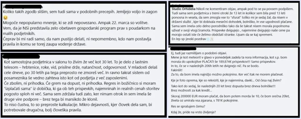 Ena odmevnejših je bila objava Nataše, ki je pred dvanajstimi leti stopila na pot samostojnega podjetništva. Po dobrem desetletju garanja sporoča vladajočim: Draga moja Slovenija, smo res na točki, kjer se pridne podjetnike kaznuje in lenobo nagrajuje? Smo res zabredli tako zelo globoko? Še en takšen mandat (pa sploh ni pomembno, levi, desni, zgornji, spodnji…) in bo Slovenija brez malih s.p.-jev. S tem ne boste ugasnili le podjetja, temveč dolgoletni trud posameznikov, da si zgradijo lepšo prihodnost.