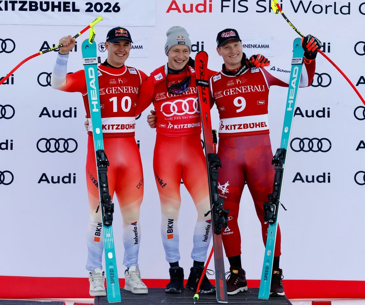 The Super-G podium at Kitzbühel: Marco Odermatt 1st, Franjo von Allmen 2nd, Stefan Babinsky 3rd. | Image: FIS Alpine