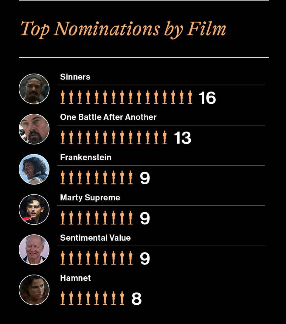 Цели 16! номинации има силно избутваната с пиар вампирска блус драма на Райън Куглър “Грешници”. Очакваше се филмът да счупи историческия рекорд от 14, държан досега от три филма: “Всичко за Ева” (1950), “Титаник” (1997) и “Ла ла ленд” (2016). Много далеч от епохален шедьовър, “Грешници” дръпна пред “Битка след битка” с допълнителни номинации в техническите категории: Визуални ефекти, Звук, Грим и прически и Оригинална песен. Безспорно любопитен филм с великолепна музика, но изтърван от режисьора във втората си половина и системно надценен в САЩ заради афроамериканските си корени. И двата фаворита са на студио Warner Bros., което събра забележителните 30 номинации в тазгодишния тираж на “Оскарите” в навечерието на продажбата си на Netflix за рекордна сума.
