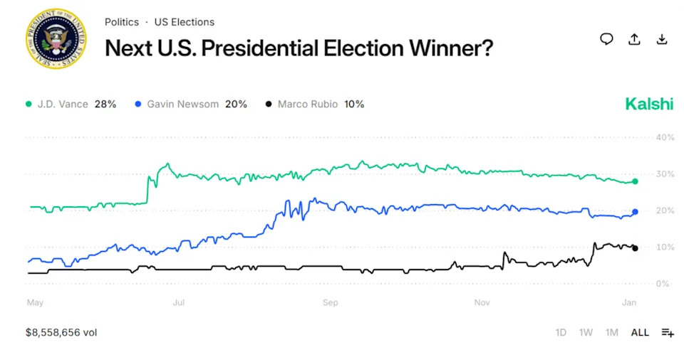 Data from Kalshi, a federally authorized betting platform, shows that over $8.5 million has been bet on the contract “Next U.S. Presidential Election Winner?”