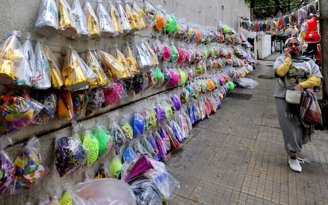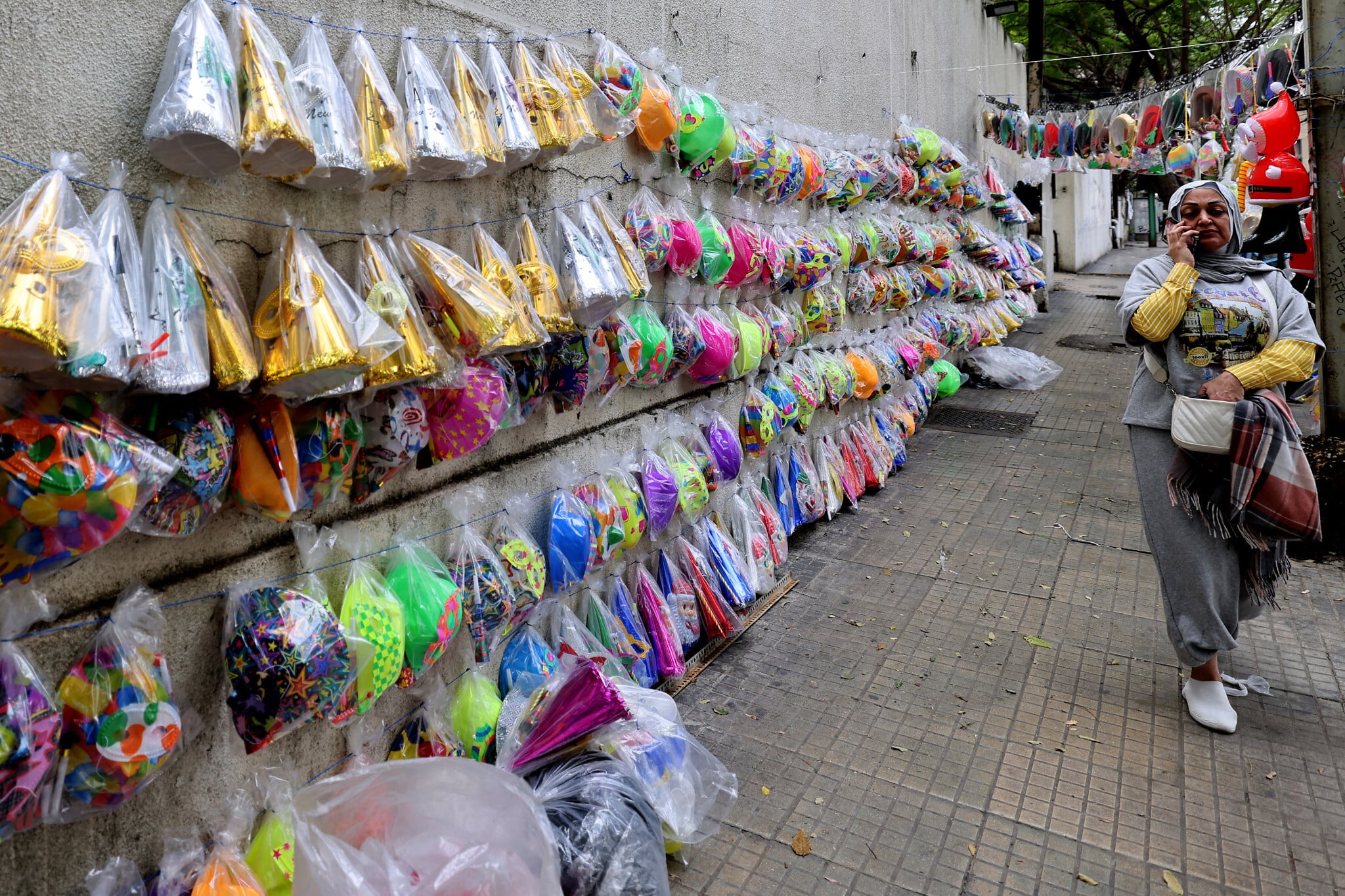 A woman speaks on her mobile phone as she walks past party accessories for New Year’s Eve celebrations displayed along a street in Beirut, Lebanon, December 31, 2025. (Anwar Amro/AFP)