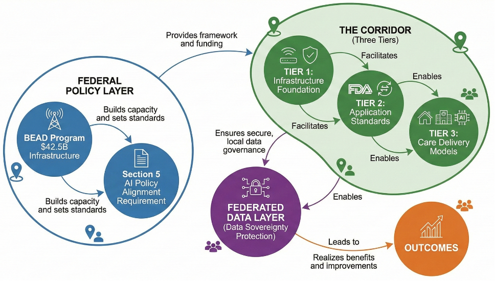 The Federal-Rural AI Corridor Architecture illustrates how Section 5 linkage of BEAD funding to AI policy alignment would create practical infrastructure for addressing severe health care workforce shortages.
