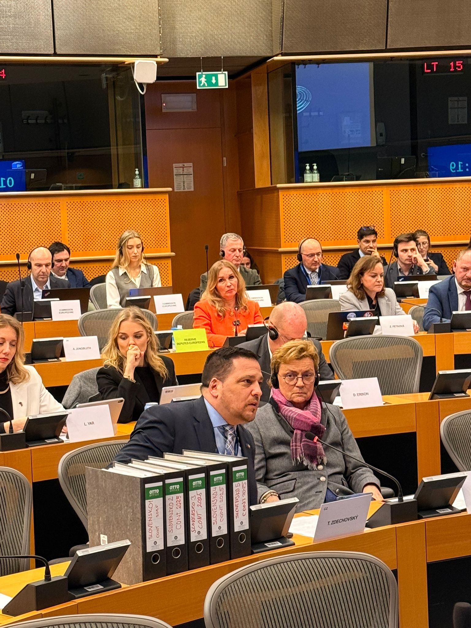 (Vpredu) Tomáš Zdechovský (KDÚ-ČSL), (za ním zľava) Lucia Yar a Veronika Cifrová Ostrihoňová (obe PS), (v strede v oranžovom) Zuzana Šubová (Pirátska strana – Slovensko), (po jej ľavej ruke) riaditeľka Zastavme korupciu Zuzana Petková a exminister pôdohospodárstva Zsolt Simon počas vypočutia Výboru Európskeho parlamentu pre kontrolu rozpočtu (CONT) v belgickom Bruseli, 27. január 2026 (Foto: Tomáš Zdechovský)