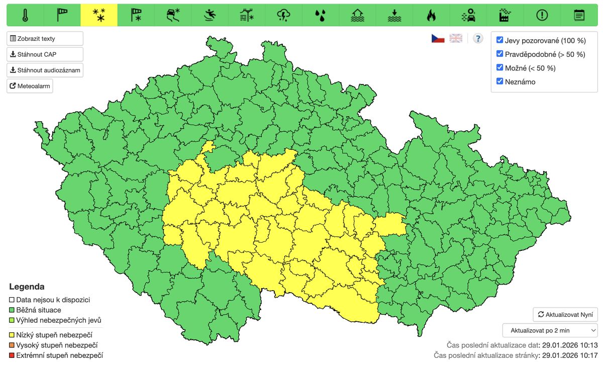 „Během čtvrtka (29. 1.) se na většině území ČR bude vyskytovat sněžení. Zejména v okolí Českomoravské vrchoviny a v jihovýchodní polovině středních Čech napadlo do 5 cm nového sněhu a do večerních hodin připadne od 2 do 7 cm nového, většinou mokrého sněhu,“ varuje ČHMÚ.