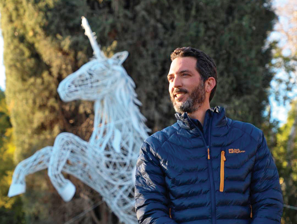 Tom Amit, CEO of the Jerusalem Botanical Gardens with a sculpture from “Winter Dreams.” (Credit: Sivan Farag)