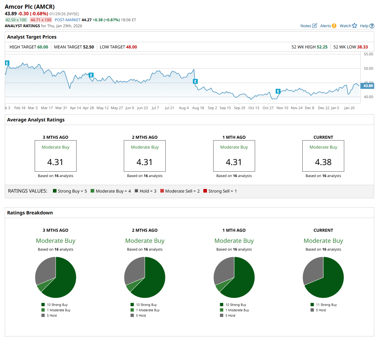 On Jan. 28, Morgan Stanley (MS) analyst Joseph Michael downgraded Amcor to “Equal Weight,” with a price target of $46, indicating a 4.8% potential upside from the current levels.