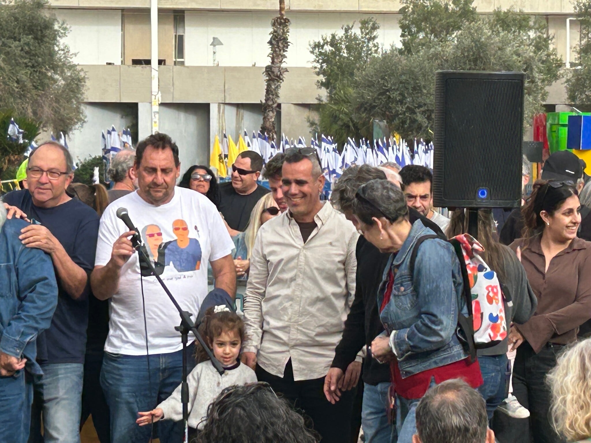 Miran’s father, Dani, also spoke and made a public request for the name of the plaza to remain “Hostages Square” despite all the captives returning home. He proposed dedicating one corner of the square as a memorial to the hostages and suggested placing a metal sculpture of a tree there, where people can hang mementos to the hostages.