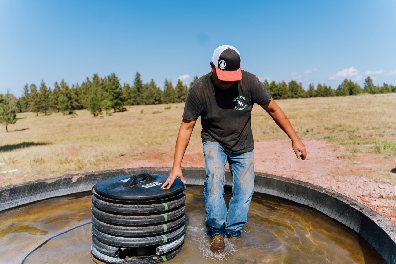 Brandon Small wades through a buffalo water trough that he just performed maintenance on while he takes us on a tour of the Northern Cheyenne buffalo habitat. Photos by Ilana Newman/Daily Yonder.
