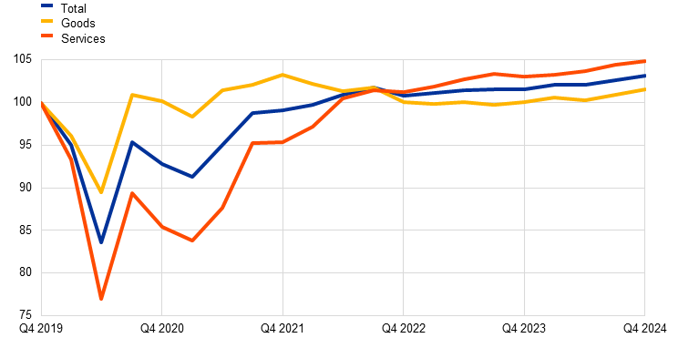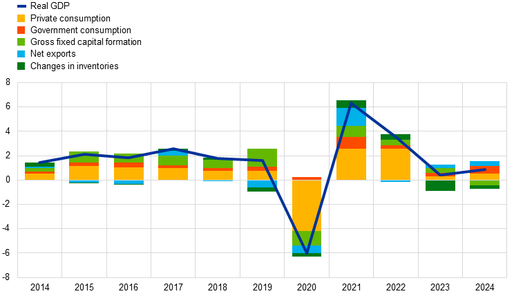 Euro area real GDP grew by 0.9% in 2024, compared with 0.4% in 2023 (Chart 1.3). Quarterly growth rates turned positive at the start of 2024, after five consecutive quarters of stagnation, before slowing down again at the end of the year. The strengthening in growth was attributable mainly to the services sector, which continued to benefit from post-pandemic structural changes including a faster shift towards a more knowledge-based economy, the green transition and changing consumer spending patterns. Recovering real incomes, global trade and the Next Generation EU (NGEU) programme also supported economic growth. At the same time, the industrial sector remained weak owing to a combination of both structural and cyclical factors. The industrial sector was more affected than services by the still restrictive conditions from the past monetary policy tightening cycle and high input costs. While most models show that the peak impact of the tightening on economic activity was reached in the period at the end of 2023 and the beginning of 2024, the monetary policy loosening cycle which started in mid-2024 had not yet fed through the economy. The industrial sector was also affected by the euro area losing export market share, as well as by regulatory challenges and by elevated uncertainty relating to both political and geopolitical events. Overall, growth in 2024 reflected positive contributions from private and public consumption as well as net trade, while investment and changes in inventories dampened economic activity.