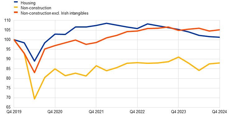 Housing investment fell strongly in 2024, amid still restrictive financing conditions and weak demand. It contracted by 4.0% compared with 2023, recording the largest annual decline since 2009, during the global financial crisis. This contraction was mainly due to the lagged impact of the monetary policy tightening, resulting from higher mortgage rates and tighter bank lending standards. Although real incomes were recovering and house price growth remained modest, tight financing conditions limited housing affordability and depressed demand for residential real estate property. However, given the strong post-pandemic recovery in housing investment, in part supported by (now expired) generous fiscal incentives in Italy, housing investment remained 1.3% above its pre-pandemic level at the end of 2024, although it fared worse than private consumption (3.1%) and non-construction investment (5.2% excluding Irish intangibles).
