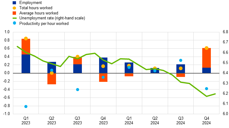 The euro area labour market remained resilient overall in 2024, although employment growth slowed relative to recent years and survey indicators suggested that labour markets were cooling over the course of the year. The unemployment rate declined from 6.5% in January to 6.2% in December – one of the lowest points recorded since the introduction of the euro and 1.3 percentage points below the pre-pandemic level observed in January 2020. The unemployment rate was also 6.2% on average in the last quarter of the year (Chart 1.5). Total employment and total hours worked kept broadly in line with the growth of the economy, both rising in 2024 by 1%. These developments led to a largely flat productivity path. The weak growth of labour productivity was mostly cyclical, driven by weak demand, while companies hoarded labour, i.e. held on to more workers than necessary in a period of low economic growth. However, structural factors may also have played a role. Average hours worked declined by 0.1% in 2024 and, as of the last quarter of the year, remained 0.9% below the pre-pandemic level. The path of average hours worked continued to reflect factors such as the hoarding of labour from the second half of 2023 and still elevated levels of sick leave. The labour force participation rate in the age group 15-74 years increased to a level of 66% in the fourth quarter of 2024, which is 1.2 percentage points above its pre-pandemic level. Women, older workers, persons with higher education and foreign workers have contributed the most to this increase in the labour force. Labour demand weakened in 2024 compared with previous years, with the job vacancy rate receding further from its peak in the second quarter of 2022 to a level of 2.5% in the fourth quarter of last year, still above its pre-pandemic level of 2.3% in the last quarter of 2019.[2] The catch-up of nominal wages with inflation favoured a realignment of employment and output dynamics, while bringing real wages more into line with the recovery in productivity. Therefore, by means of its medium-term orientation, and without prejudice to maintaining price stability, the monetary policy of the ECB contributed to supporting employment and productivity, which are among the European Union’s objectives to which the ECB can contribute.