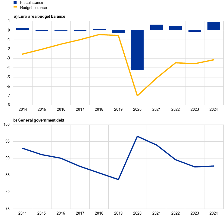 The euro area debt-to-GDP ratio is expected to have increased slightly to close to 88% in 2024, from its already elevated level of 87.4% in 2023, and thus remain well above its pre-crisis level of 83.6% in 2019 (Chart 1.6). This increase was likely driven by the primary deficit and positive deficit-debt adjustments.