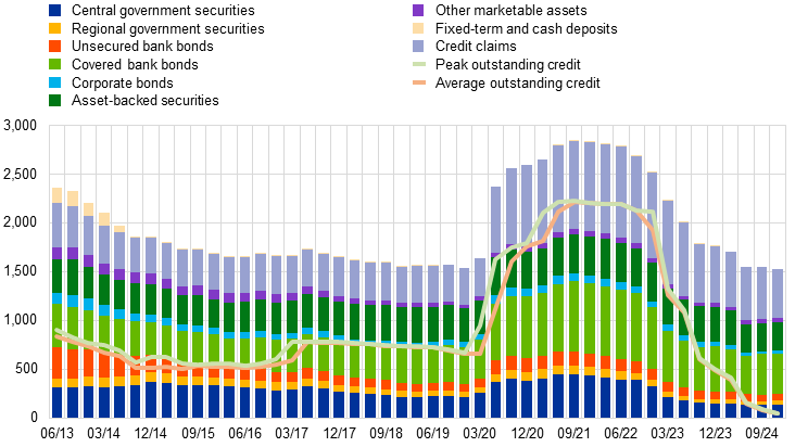 In monetary policy implementation, the climate-related financial disclosures of the Eurosystem’s monetary policy holdings and the ECB’s foreign reserves, published in June 2024, expanded the scope of the report from corporate assets to include other asset classes. The report now covers 99.7% of the total assets held for monetary policy purposes. The carbon emissions associated with corporate assets – for which the Eurosystem targets a decarbonisation path that supports the goals of the Paris Agreement and the EU’s climate neutrality objectives – continued to decrease. Since corporate bond reinvestments were discontinued as of 31 December 2024, this reduction will be based on the maturity profile of these assets and on actions by the firms themselves. In May 2024 the Governing Council agreed that interim emission reduction targets will be set for the corporate asset holdings, at this stage to internally monitor the corporate portfolios’ emission reduction trajectory. If deviations from the desired trajectory are identified, the Governing Council will assess the need for remedial actions, within its mandate, on a case-by-case basis. In addition, the Eurosystem continued to further incorporate climate change considerations into its monetary policy operations and enhance its risk assessment and management. For example, the Eurosystem NCBs now apply the common minimum standards for their in-house credit assessment systems (ICASs), in line with the commitment made in July 2022.[97]