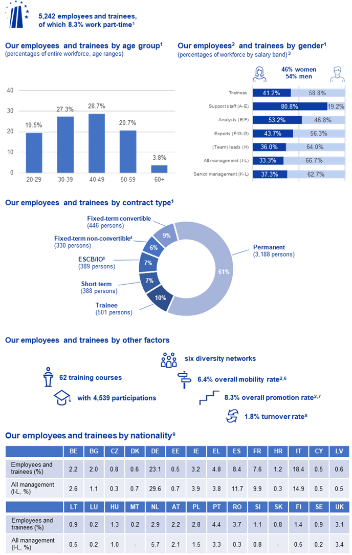 In 2024 the ECB continued to prioritise efforts to foster an open working culture and a dynamic, inclusive and supportive workplace where every employee is empowered to excel. It introduced several initiatives to enhance well-being, career development, and diversity and inclusion (D&I). The ECB also started the transition to dynamic workspaces, a new design of our office spaces that reflects the evolving landscape of hybrid remote and office work. New policies, such as fully paid special parental leave and increased leave for carers, underscore the ECB’s dedication to fostering an equitable environment. A Career Portal was launched to support staff development, offering opportunities for mobility (whereby staff can change jobs internally) and mentoring. The focus on D&I is evident through ambitious gender targets and initiatives that address its different facets. Through these efforts, the ECB aims to cultivate a workplace where all employees feel valued and empowered to contribute their best to Europe’s future.