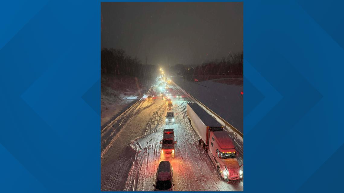 Due to the freezing temperatures and inches of snowfall, the large trucks can’t gain enough momentum to move along, keeping traffic at a glacial pace.