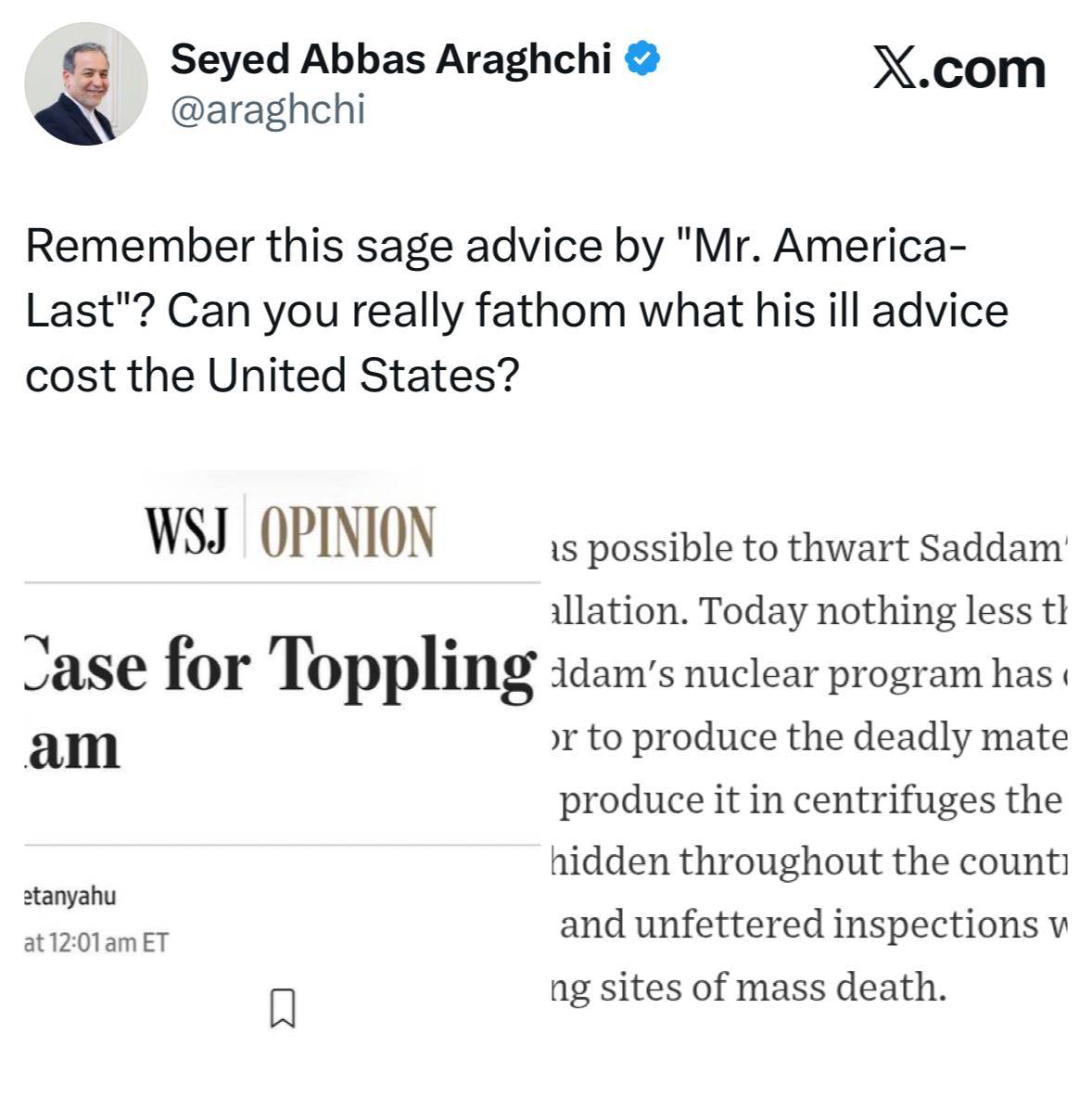 In a post on the social media platform X, the Iranian foreign minister referred to remarks made by Israeli Prime Minister Benjamin Netanyahu, writing: “Remember this sage advice by ‘Mr. America-Last’? Can you really fathom what his ill advice cost the United States?”