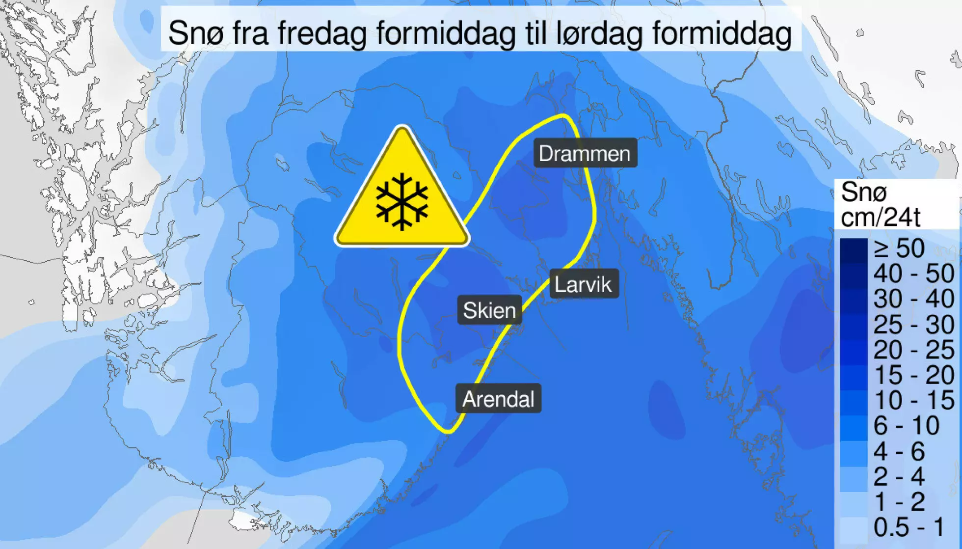 – Fra fredag formiddag til lørdag formiddag er det ventet rundt 10-25 cm snø. Nær kysten av Telemark og Vestfold kan nysnø kombinert sterk vind gi lokal snøfokk, heter det i varselet.