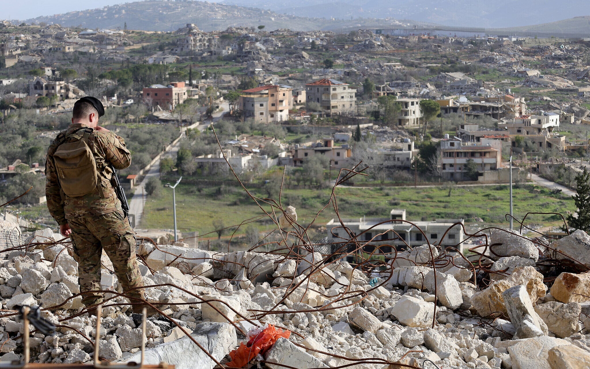 A member of the Lebanese military stands guard during a visit by Lebanon’s prime minister to the heavily-damaged southern village of Kfar Kila, near the border with Israel on February 8, 2026. (Rabih Daher/AFP)