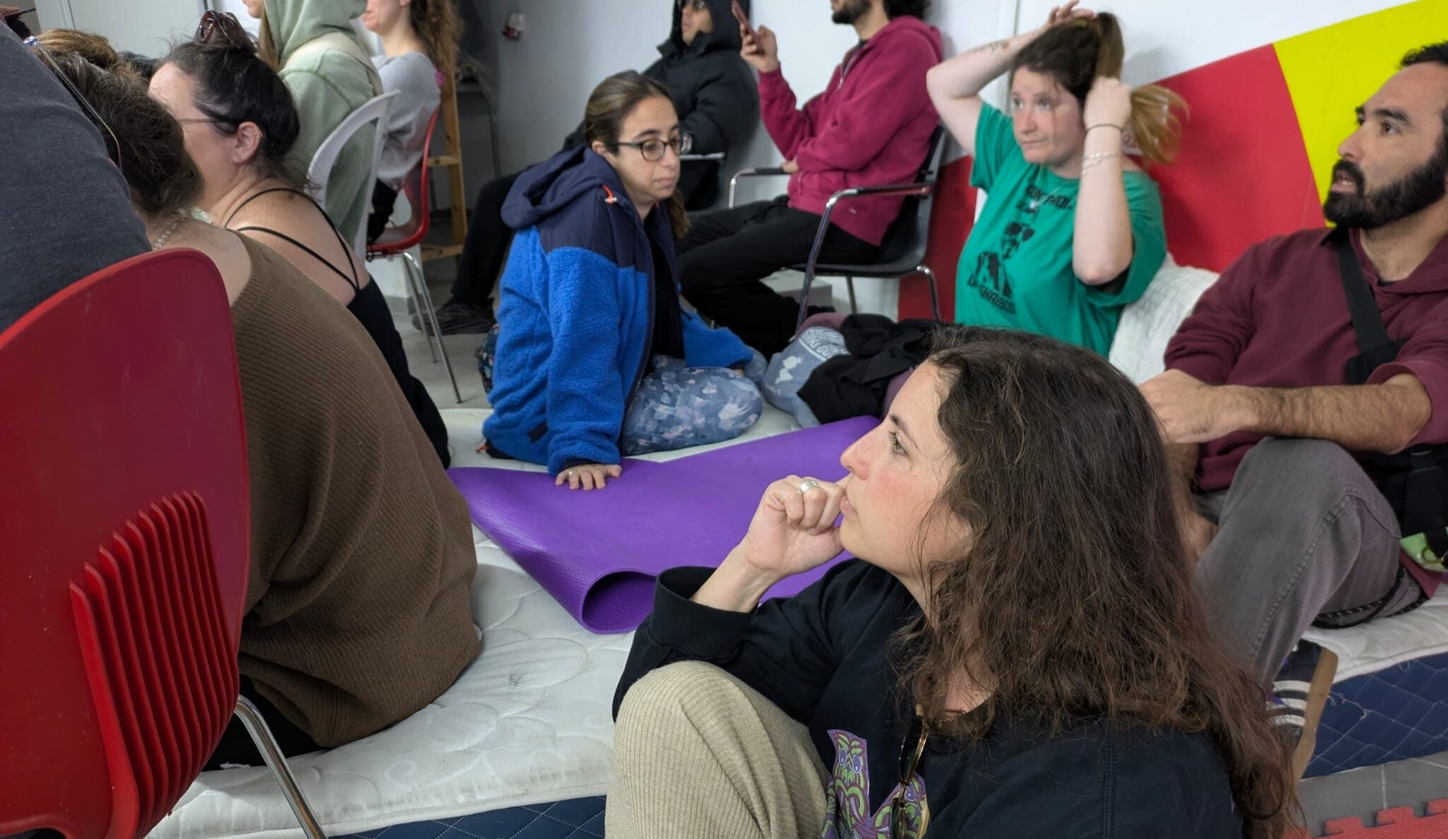In a shelter in a Jaffa apartment building, residents discussed about whether a new delivery service would deliver during sirens, March 1, 2026. (Deborah Danan/ JTA)