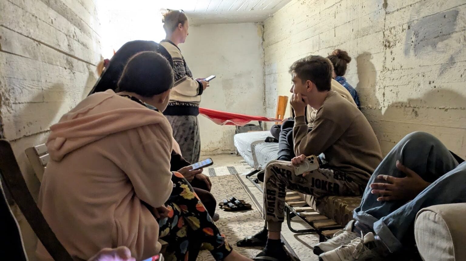 Steph Graber, at front, sits in a public shelter in Jaffa, Israel, March 1, 2026. (Deborah Danan/JTA)