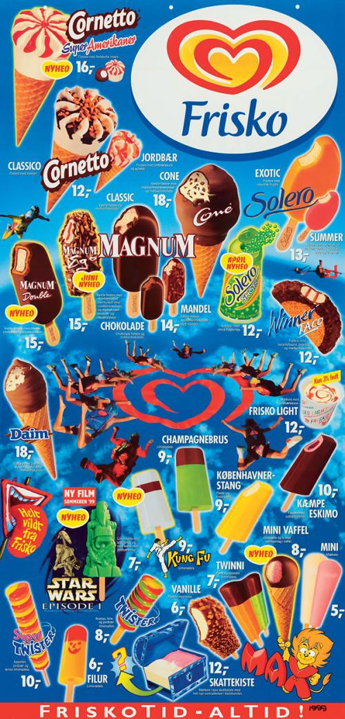 Det eneste positive ved plakaten og de plakater andre har linket til er gensynet og minderne om alle de skøre og gode is. Batman-is fx. Og alle klassikerne sim Zapp og Kung-Fu, Lynstang og Kæmpeeskimo mv. Og Magnum da de kom med deres dobbeltlagede is med karamel imellem.