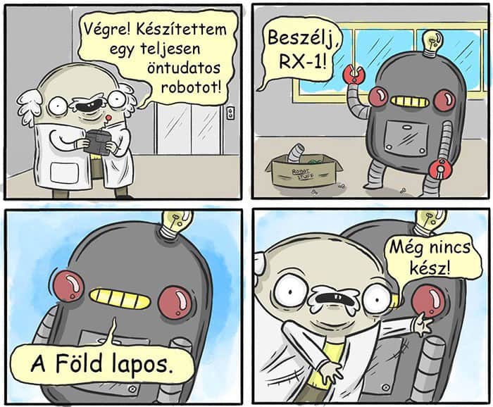 Progromozó: Jujj főnök, basszameg ez nem azt válaszolta, ami a lehetséges válaszokhoz be van írva! Tudatra ébredt!