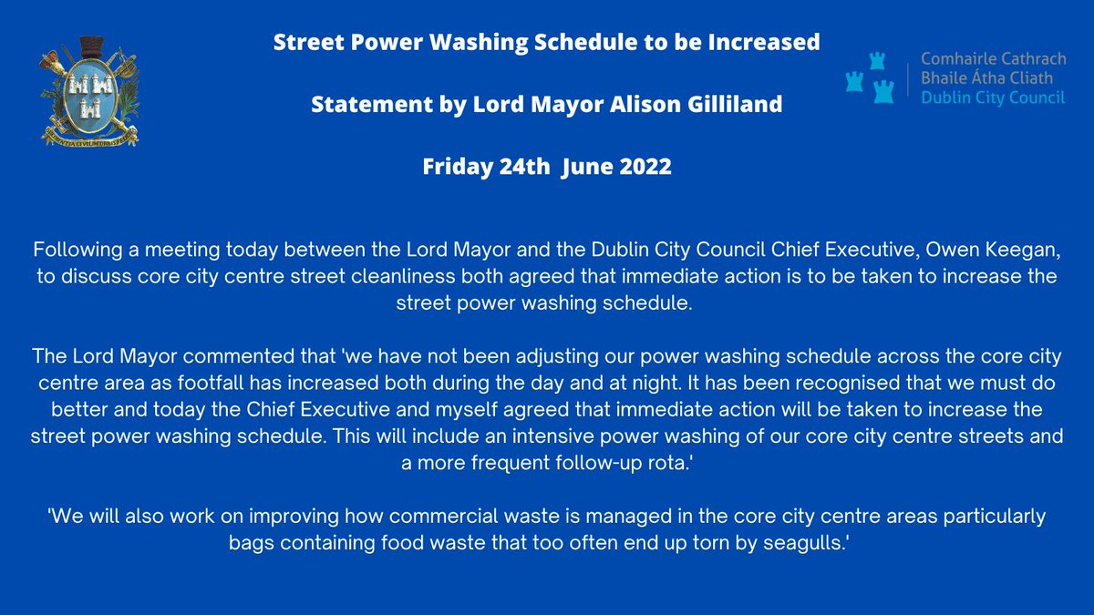 I met with Chief Executive @DubCityCouncil and we agreed that immediate action will be taken to increase the street power washing schedule in our city including intensive power washing of our core city centre streets and a more frequent follow-up rota. Statement ⬇️ pic.twitter.com/ab2ICsvrvp