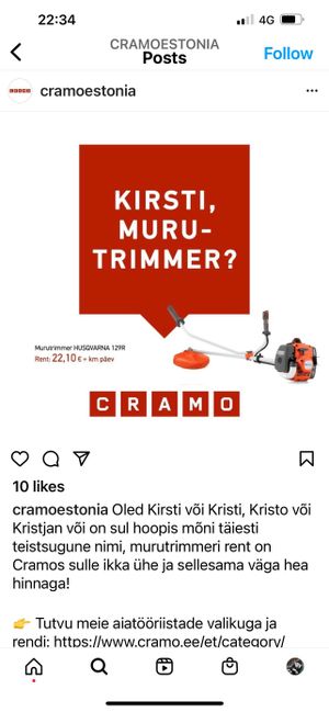 Tundub põnev reklaam, kas seda saab kuskil äkki näha ka maksumüürita või kuidagi? Tags:estonia 9 comments Mage nali, aga eetilisele käitumisele ei maksa Kirstil küll viidata. Aga miks ta seda ette ei näinud? Kus koolides õpetatakse seda posimist ja ennustamist jne?! Miks mõtlev haritud inimene sellise lollusega tegeleb? Lihtsalt raha? [LINK](https://f9.pmo.ee/be-NIpJ9RRHIQpRrmZ6n52TV1CI=/300×0/smart/nginx/o/2022/08/01/14733191t1h2774.jpg) praeguseks kustutatud reklaamile Kirstutrimmer MuruTrimmer See poleks ilmselt olulist tähelepanu saanud kui ise ei oleks trimmerit käima tõmmanud. AG x Kirsti Timmer- Mul on trimmer Enda arvates on ainuke Kristi terve Eesti peale Leave a ReplyYou must be logged in to post a comment.