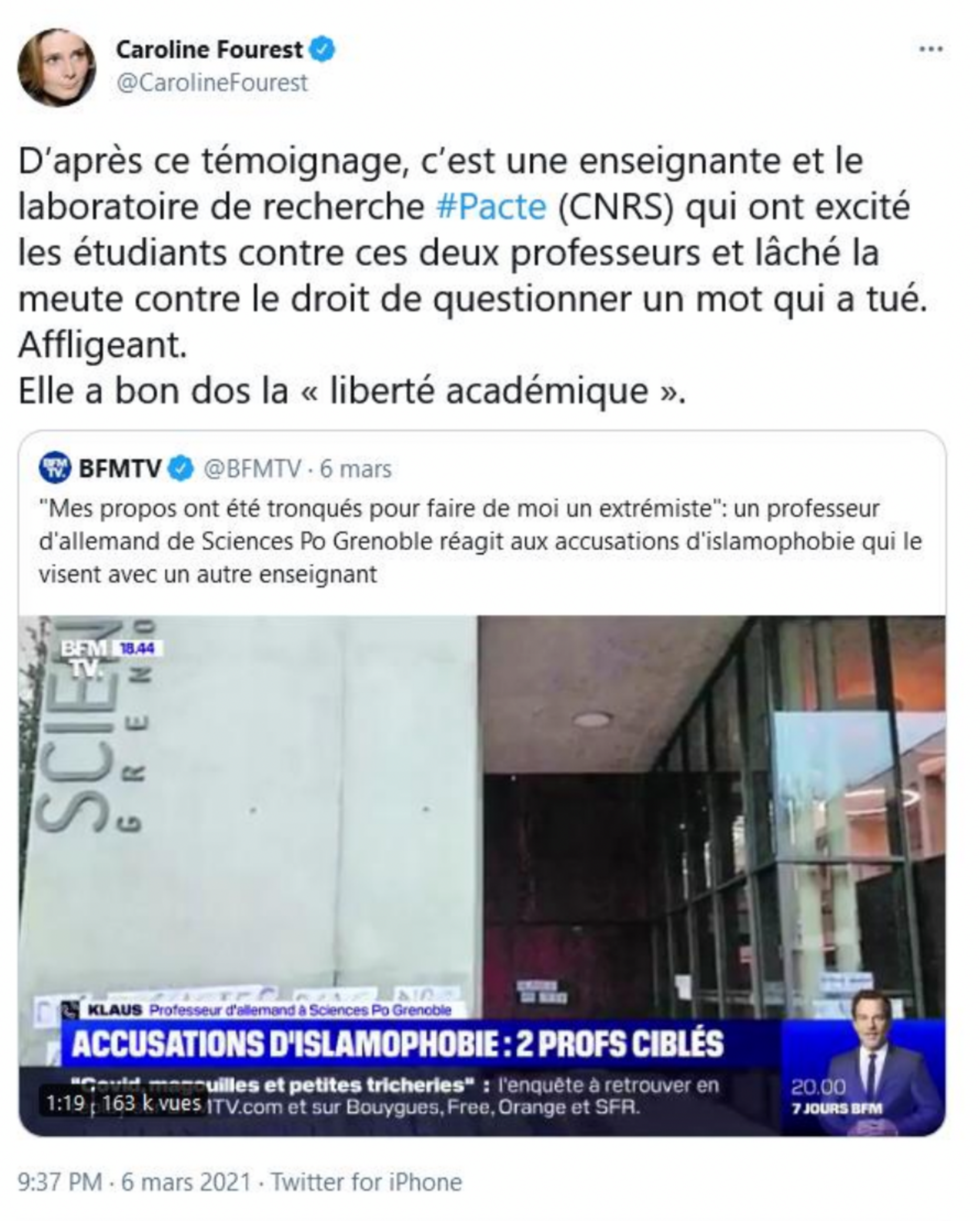 > L’accusation est rapidement reprise par Marianne, BFMTV et par l’essayiste Caroline Fourest. « D’après ce témoignage, c’est une enseignante et le laboratoire de recherche Pacte (CNRS) qui ont excité les étudiants contre ces deux professeurs et lâché la meute contre le droit de questionner un mot qui a tué. Affligeant. Elle a bon dos la “liberté académique” », tweete cette dernière le 6 mars 2021. Tout est faux [comme l’a révélé Mediapart](https://www.mediapart.fr/journal/france/211221/sciences-po-grenoble-les-memes-intox-pour-un-nouvel-emballement), mais qu’importe, l’accusation se propage en même temps que naît l’emballement médiatique.